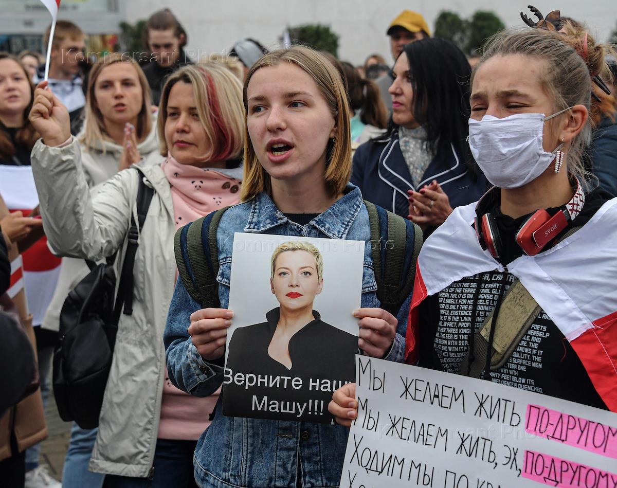The political situation in Minsk. Rally in support of Member of the Belarusian Opposition Coordination Council Maria Kolesnikova near Komarovsky Market. Rally participants.