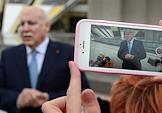 Ветеран-блокадник Мария Ягодницына (справа) и посол России в Белоруссии Дмитрий Мезенцев (в центре) во время церемонии возложения цветов к cтеле "Минск - город-герой".
