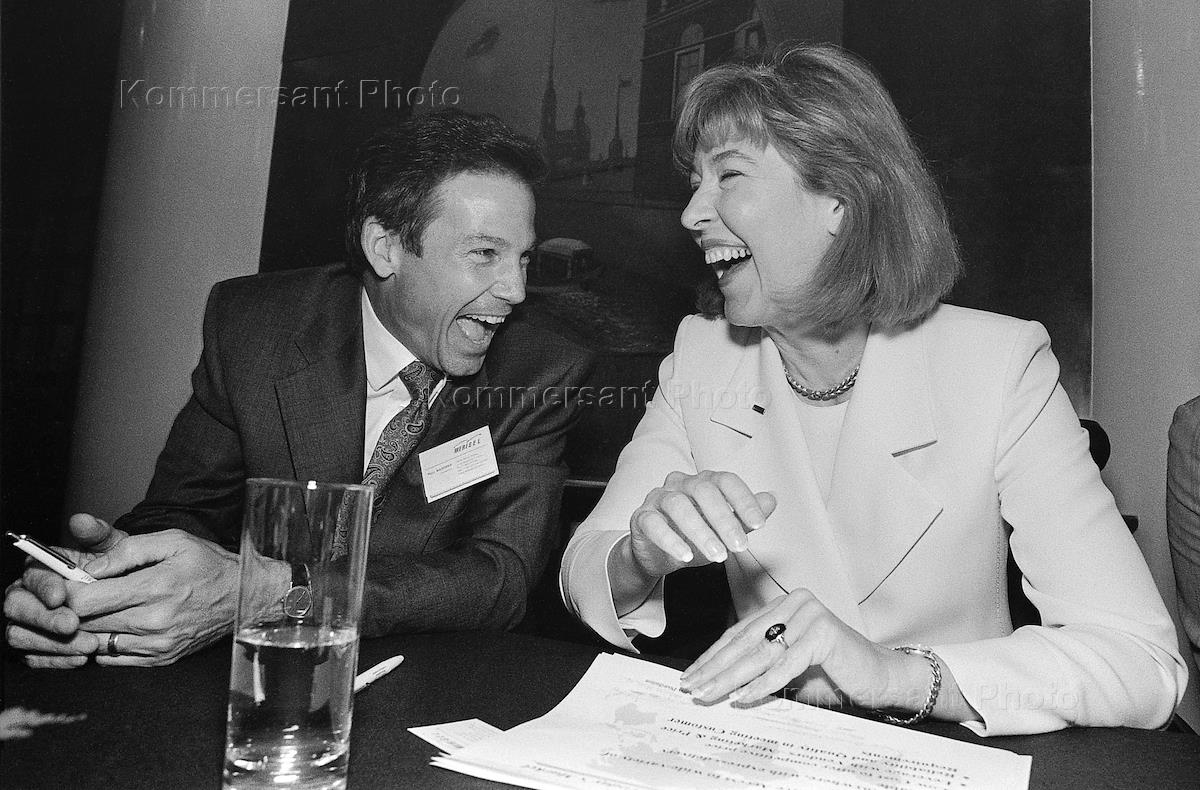 Секретарь национального комитета банков-членов SWIFT Ирина Степанова (справа) и менеджер SWIFT Эккерхард Штарк (слева) во время пресс-конференции.