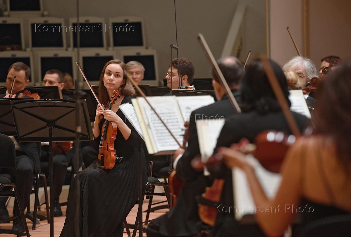 Концерт пианиста Михаила Плетнева и Российского национального оркестра в концертном зале им. П. И. Чайковского. Дирижер Михаил Татарников (в центре) во время концерта.
