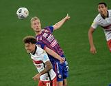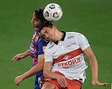 Российская Премьер-Лига (РПЛ). Тинькофф - Чемпионат России по футболу 2020/2021. 7-й тур. Матч между командами ЦСКА (Москва) и "Спартак" (Москва) на стадионе "ВЭБ Арена". Игрок команды "Спартак" Роман Зобнин (слева) и игрок команды ЦСКА Вадим Карпов (справа) во время матча.