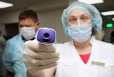 Жанровая фотография. Медицинский сотрудник измеряет температуру бесконтактным градусником.