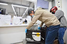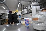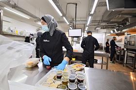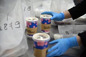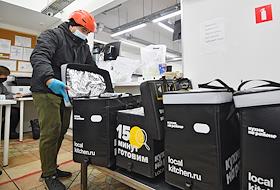 Работа сервиса готовой еды "Кухня на районе" (Local Kitchen). Сотрудники службы доставки во время упаковки еды в сумки.