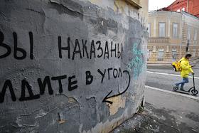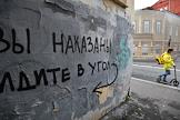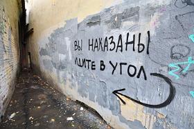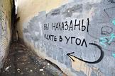 Жанровая фотография. Надпись на стене дома: "Вы наказаны, идите в угол".