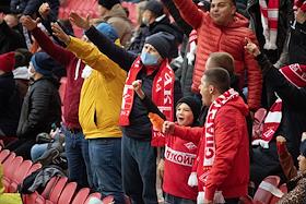 Российская Премьер-Лига (РПЛ). Тинькофф - Чемпионат России по футболу 2020/2021. 8-й тур. Матч между командами "Рубин" (Казань) и "Спартак" (Москва) на стадионе "Ак Барс Арена" (Казань Арена). Болельщики команды "Спартак" на зрительской трибуне во время матча.