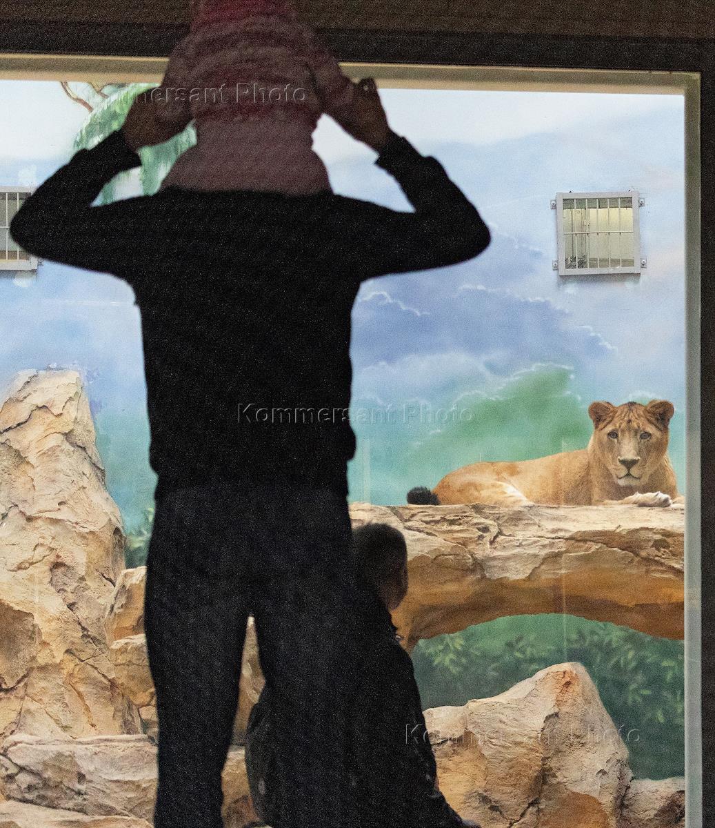 Виды зоопарка "Река Замбези". Жанровая фотография. Посетители у вольера со львами.
