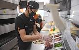 Работа ресторана сети ресторанов быстрого питания, специализирующейся на пицце, "Додо Пицца". Сотрудник ресторана во время приготовления пиццы.