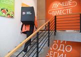 Работа ресторана сети ресторанов быстрого питания, специализирующейся на пицце, "Додо Пицца". Курьер службы доставки с фирменным коробом на лестнице.