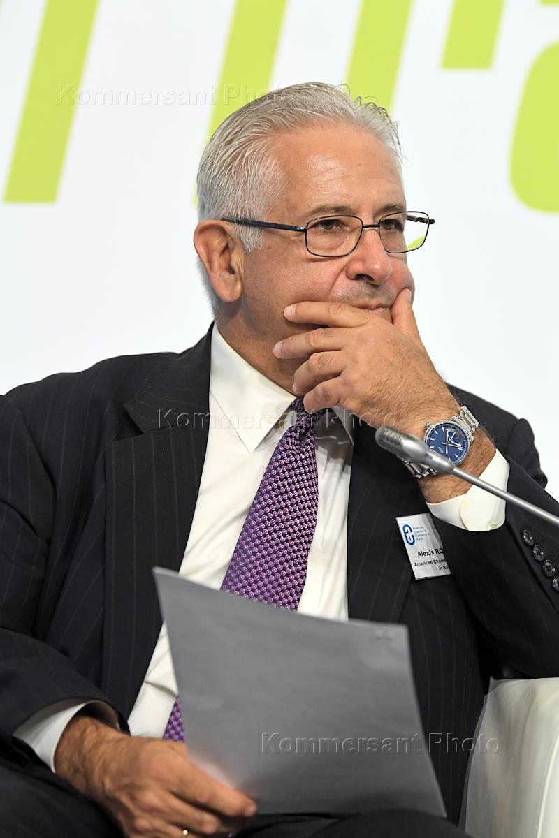 XX ежегодная Инвестиционная конференция Американской торговой палаты в России (American Chamber of Commerce in Russia, AmCham Russia) в Lotte Hotel Moscow. Глава Американской Торговой Палаты Алексис Родзянко в центре) во время конференции.