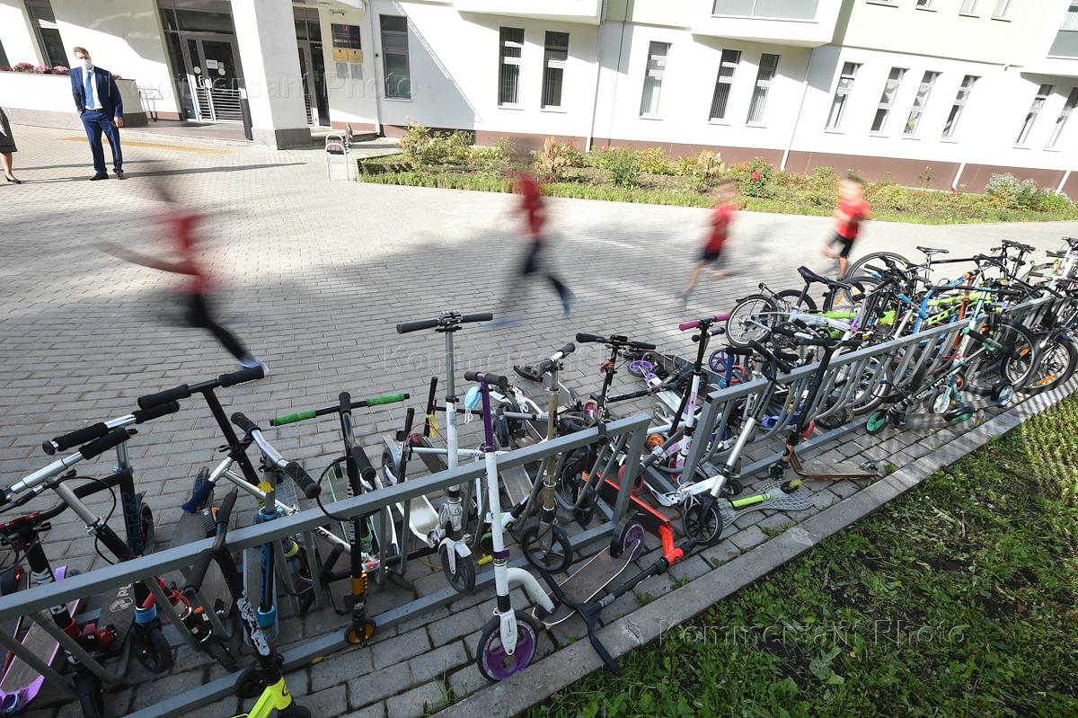 Secondary school No. 1387. Genre photo. Bicycle parking at school.