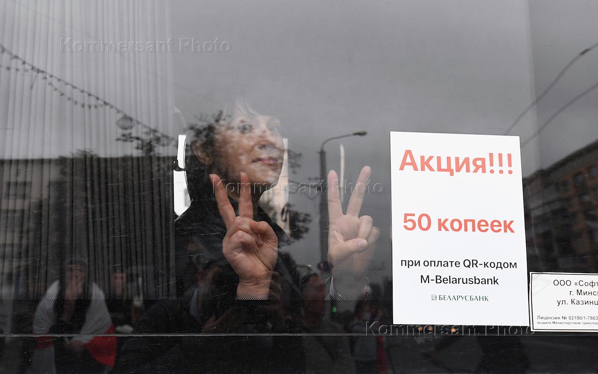 Политическая ситуация в Минске. Акция протеста сторонников белорусской оппозиции. Жанровая фотография. Пассажирка в общественном транспорте приветствует участников акции и реклама БеларусьБанка "Акция! 50 копеек при оплате QR-кодом M-Belarusbank".