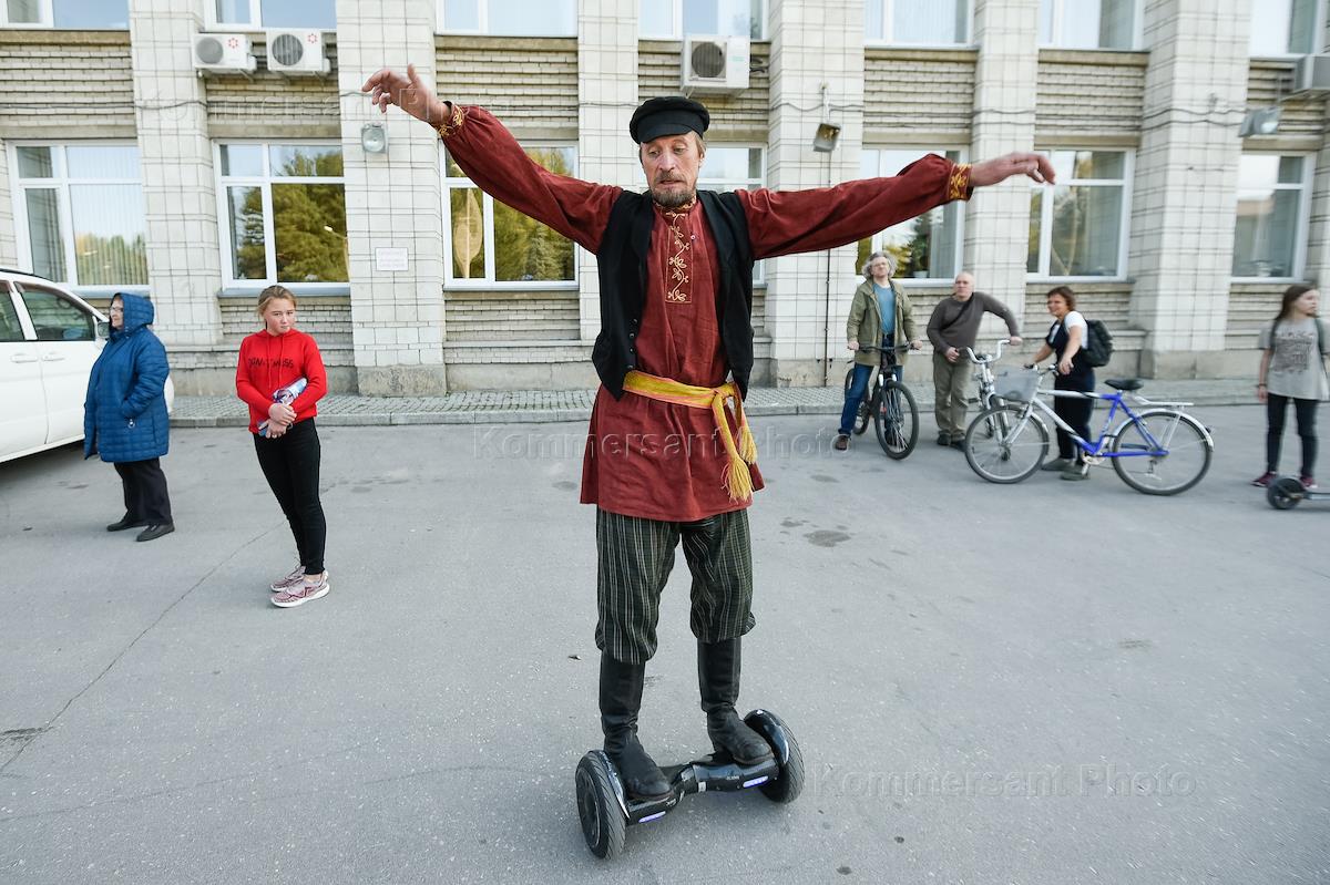 Этнокультурный практикум "По-сибирски" в Историко-архитектурном музее Института археологии и этнографии СО РАН в Новосибирске. Жанровая фотография. Участник фестиваля в народном костюме катается на гироскутере.
