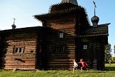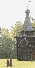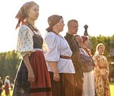 Этнокультурный практикум "По-сибирски" в Историко-архитектурном музее Института археологии и этнографии СО РАН в Новосибирске. Жанровая фотография. Участники фестиваля в русских народных костюмах на фоне Зашиверской церкви.