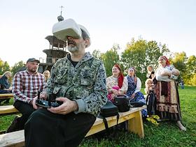Этнокультурный практикум "По-сибирски" в Историко-архитектурном музее Института археологии и этнографии СО РАН в Новосибирске. Жанровая фотография. Мужчина в шлеме-очках виртуальной реальности во время съемки на квадрокоптер и участники фестиваля в русских народных костюмах на фоне Зашиверской церкви.