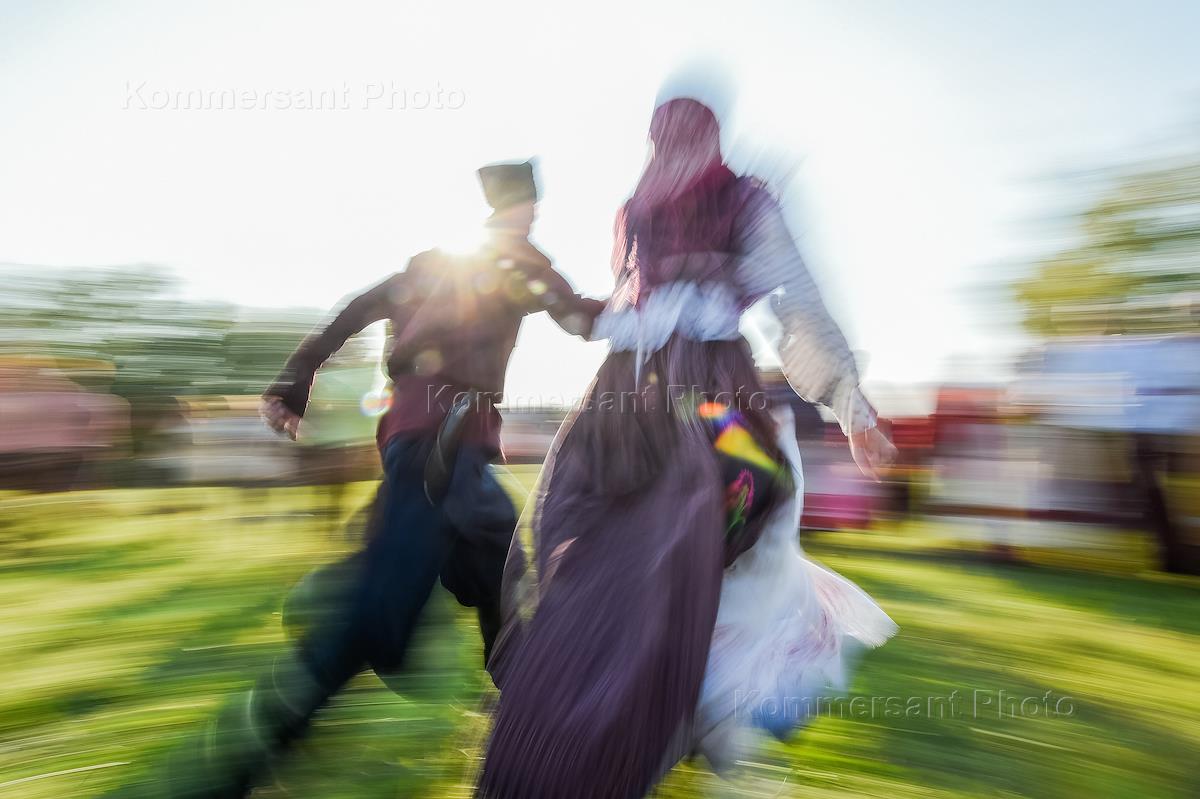 Этнокультурный практикум "По-сибирски" в Историко-архитектурном музее Института археологии и этнографии СО РАН в Новосибирске. Жанровая фотография. Участник фестиваля в народном костюме катается на гироскутере.