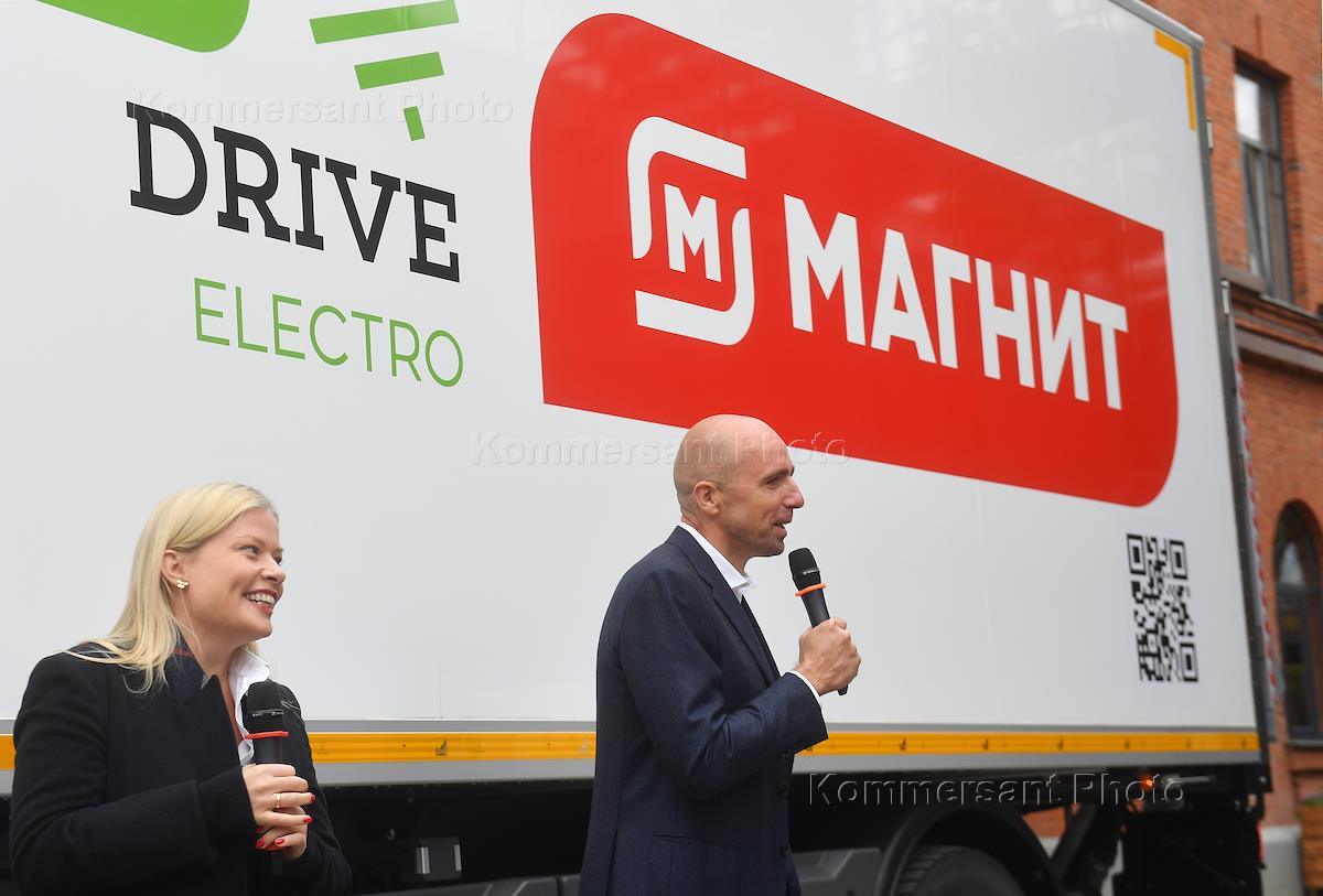 Церемония презентации и передачи в опытную эксплуатацию первого российского крупнотоннажного электрогрузовика MOSKVA, который разработан московской компанией Drive Electro, в фудмолле "Депо. Москва". Электрогрузовик спроектирован по требованиям компании "Магнит". Директор по цепочкам поставок розничной сети "Магнит" Марья Дей (слева) и генеральный директор компании Drive Electro Сергей Иванов (справа) во время церемонии.