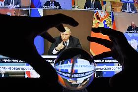 Жанровая фотография. Руки над стеклянным шаром на фоне трансляции расширенного заседания президиума Госсовета России в режиме видеоконференции.