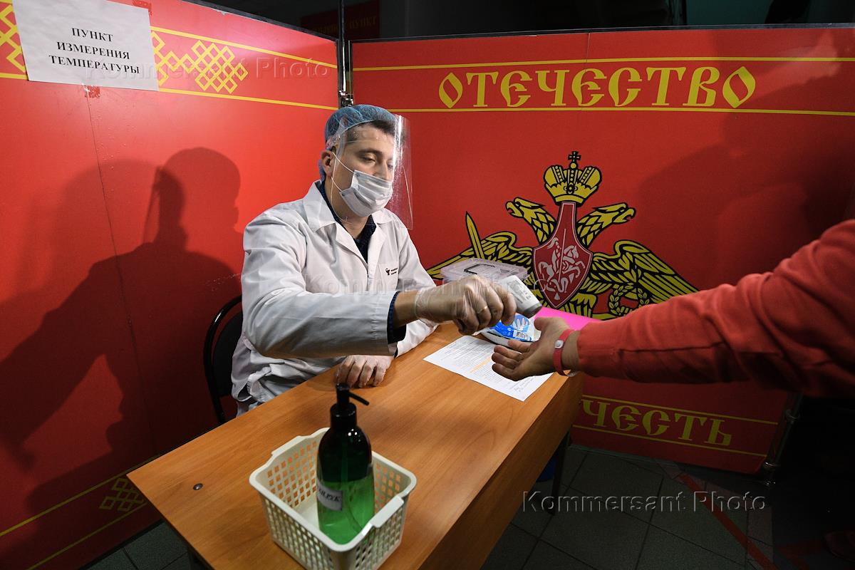 Press tour dedicated to the beginning of the autumn military draft during the coronavirus COVID-19 pandemic. Genre photo. Conscript getы medical check-up in the recruiting office.