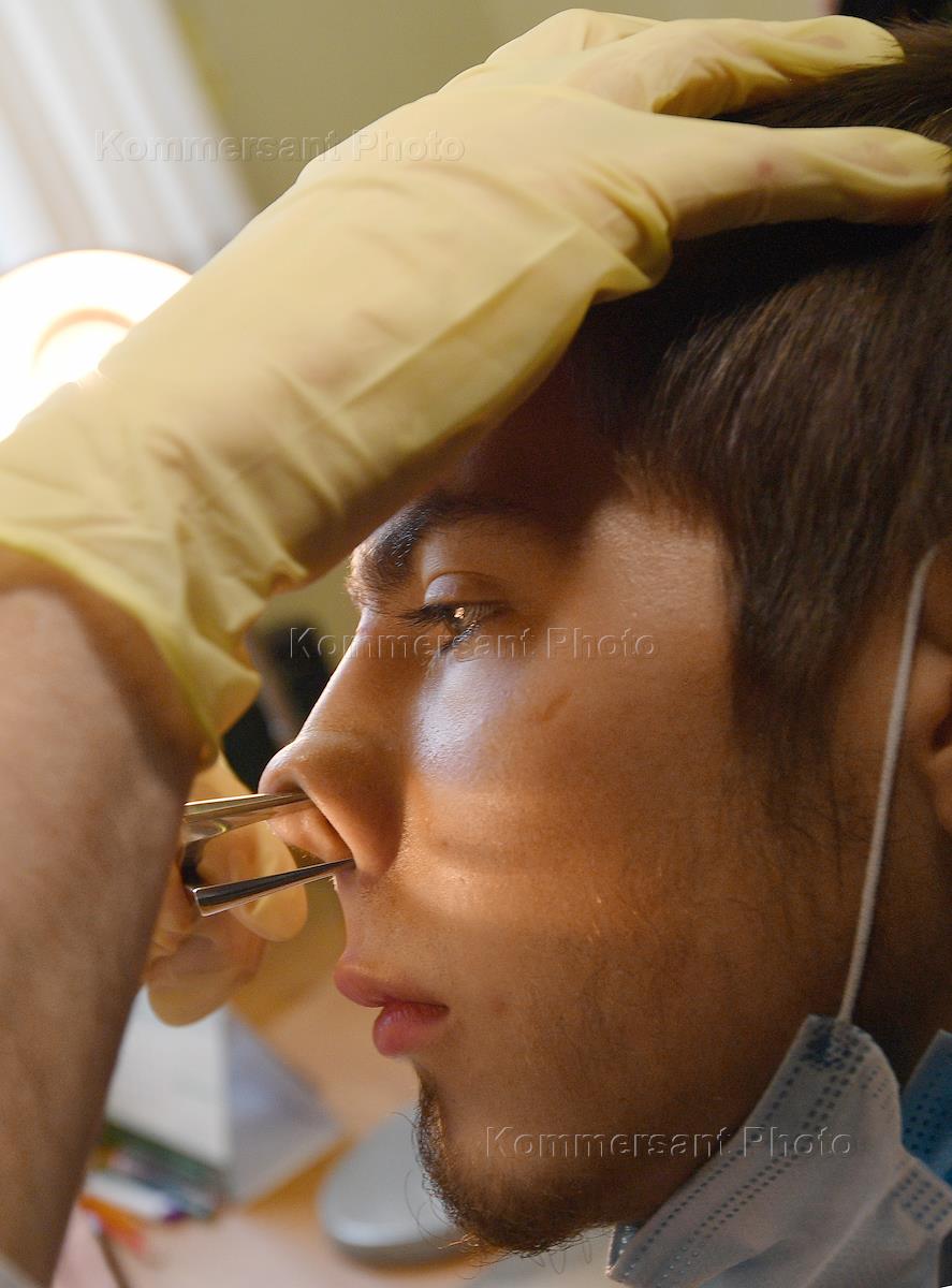 Press tour dedicated to the beginning of the autumn military draft during the coronavirus COVID-19 pandemic. Genre photo. Conscript getы medical check-up in the recruiting office.