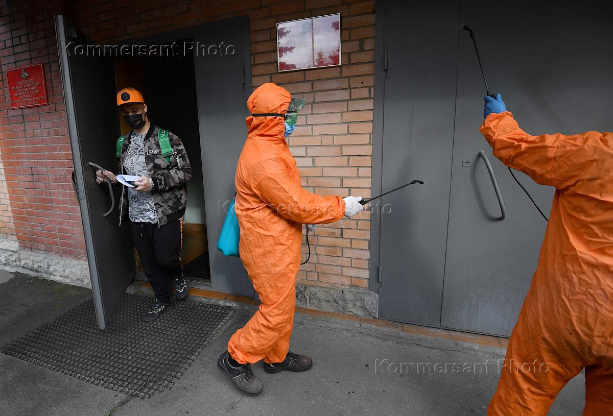 Press tour dedicated to the beginning of the autumn military draft during the coronavirus COVID-19 pandemic. Genre photo. Preventive measures against the spread of the coronavirus COVID-19. Disinfection service employees sanitise the recruiting office.