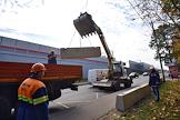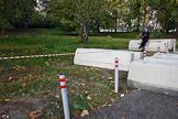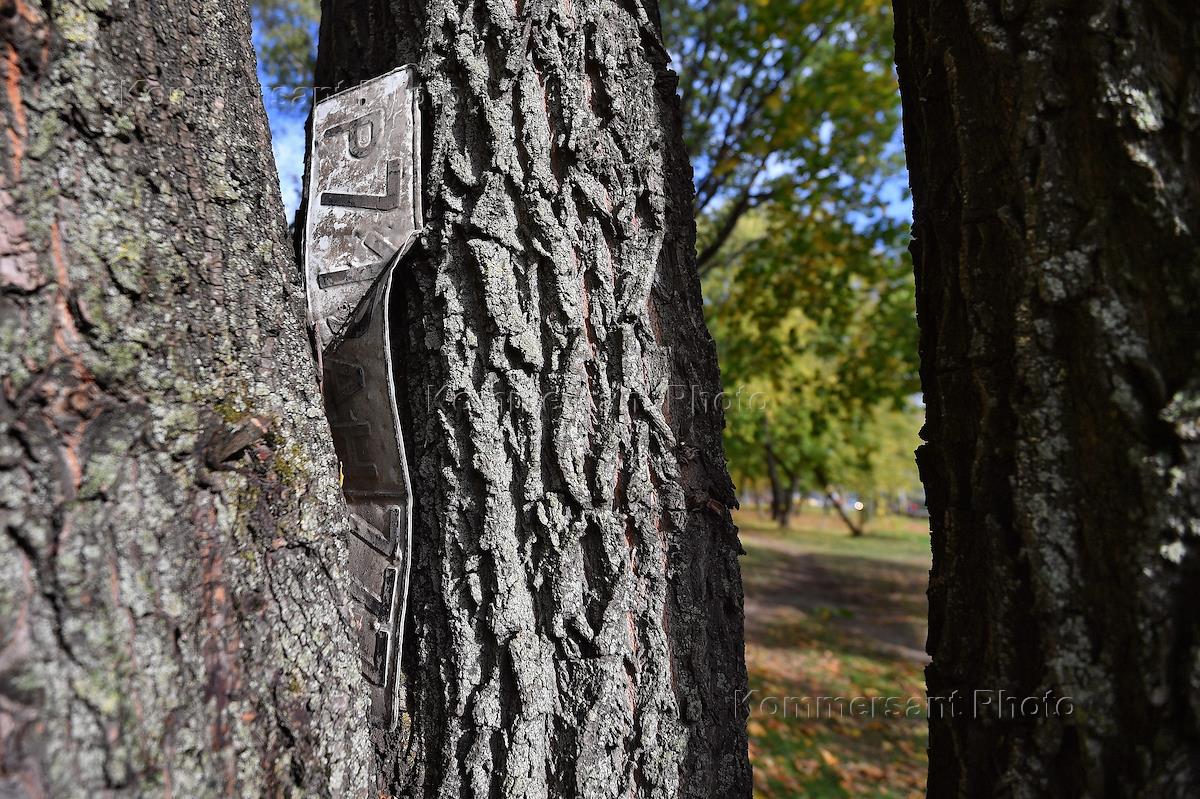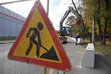 Виды Москвы. Жанровая фотография. Дорожные работы реконструкции Северного дублера Кутузовского проспекта в Кунцево на улице Ивана Франко, из-за которой планируется вырубить парк с трехсотлетними дубами. Информационный плакат о строительстве Северного дублера Кутузовского проспекта на ограде парка.