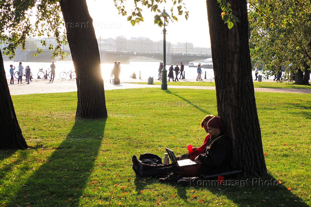 Виды Санкт-Петербурга. Жанровая фотография. Отдыхающие на Заячьем острове в сквере у Петропавловской крепости.
