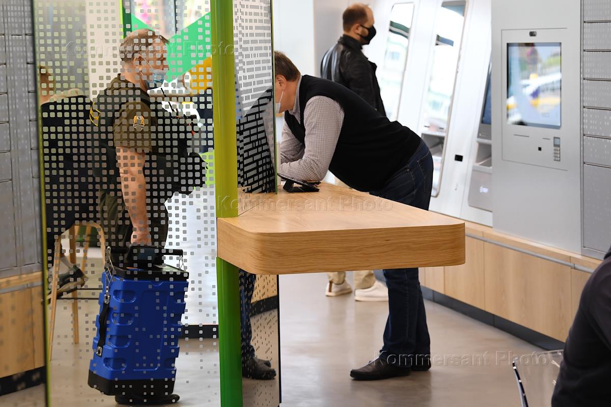 Сбер (бывший Сбербанк) открыл первый офис обновленного типа на Цветном бульваре, 2. Жанровая фотография. Клиентка и сотрудница банка в новом офисе у новых банкоматов с системой распознавания лиц и возможностью управления голосом.