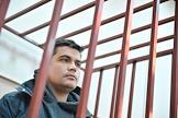 Genre photography. A police officer next to the fence in the courtroom. Handcuffs on the bars.