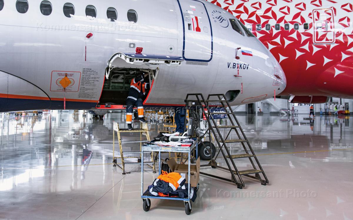 Новый ангарный комплекс для авиационно-технического обслуживания воздушных судов А-ТЕХНИКС в Международном аэропорту Шереметьево имени А.С.Пушкина. Жанровая фотография. Самолет авиакомпании "Россия" в ангаре.