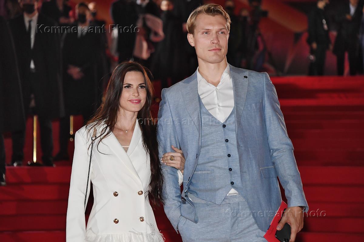 42-й Московский международный кинофестиваль (ММКФ). Церемония открытия. Актер Кирилл Зайцев (справа) и его супруга, продюсер Анастасия Трубчевская (слева) на красной дорожке перед началом церемонии.