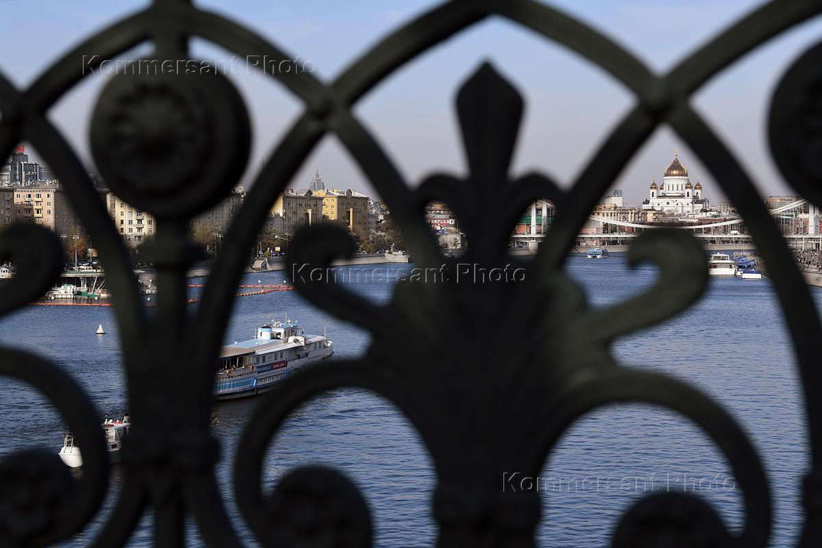Жанровая фотография. Вид на Москву-реку через кованную решетку ограждения моста.