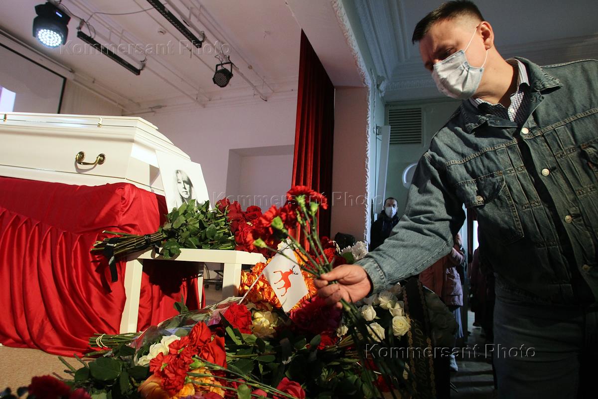Civil funeral service for journalist Irina Slavina, who burned herself in front of the Nizhny Novgorod Ministry of Internal Affairs, in the Nizhny Novgorod House of Scientists.