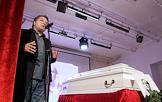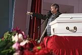 Церемония прощания в нижегородском Доме ученых с главным редактором интернет-издания "Коза Пресс" Ириной Славиной, которая 2 октября 2020 года покончила с собой у здания ГУ МВД России по Нижегородской области. Гражданская панихида. Основатель нижегородского отделения "Церкви летающего макаронного монстра" Михаил Иосилевич во время панихиды.