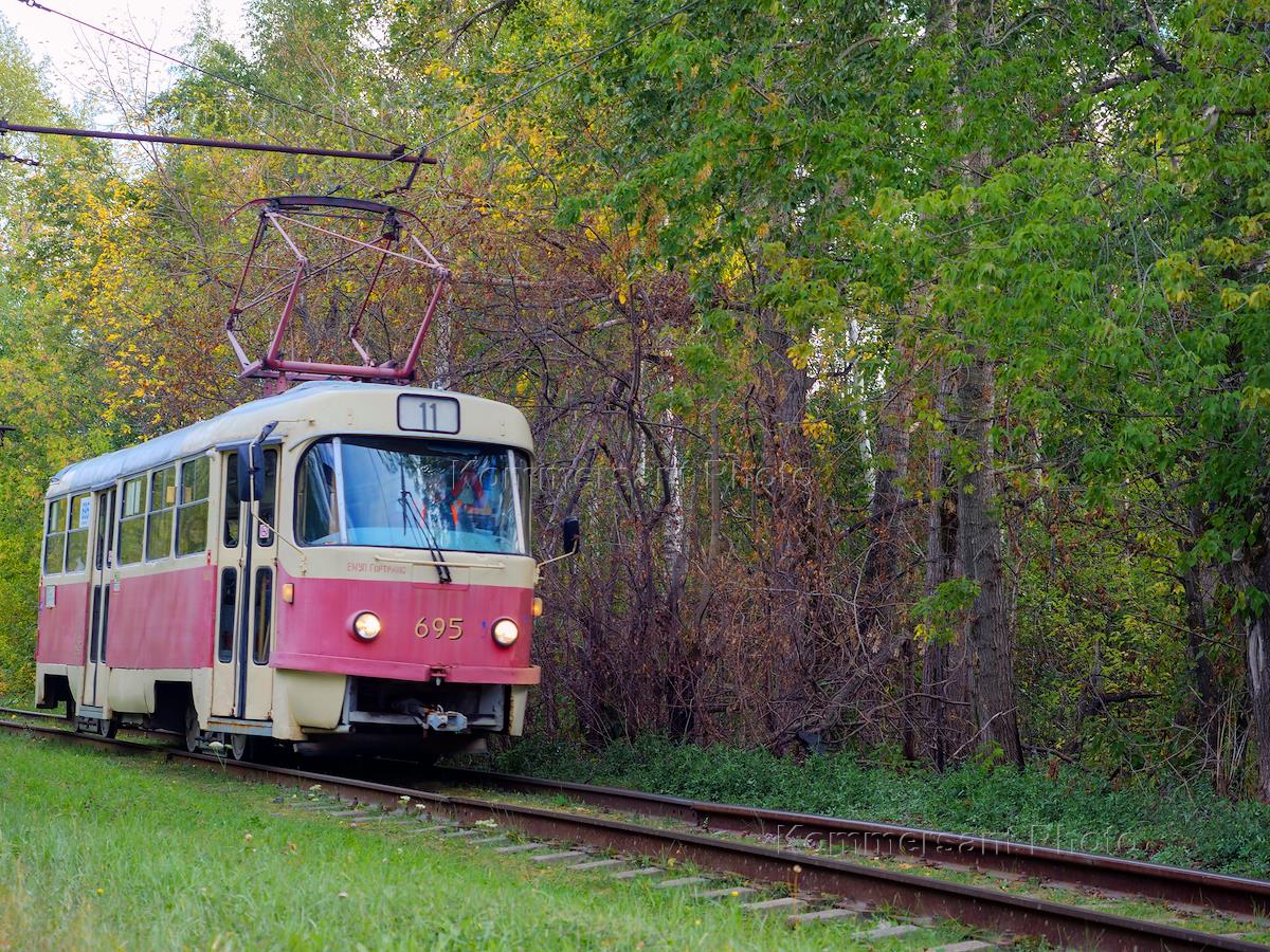 Views of Yekaterinburg. Microdistrict "Green Island". Tram number 11 on the route.