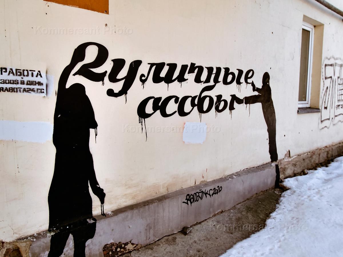 Views of Yekaterinburg. Genre photography. The inscription on the wall "2 street persons" on the wall of the building.