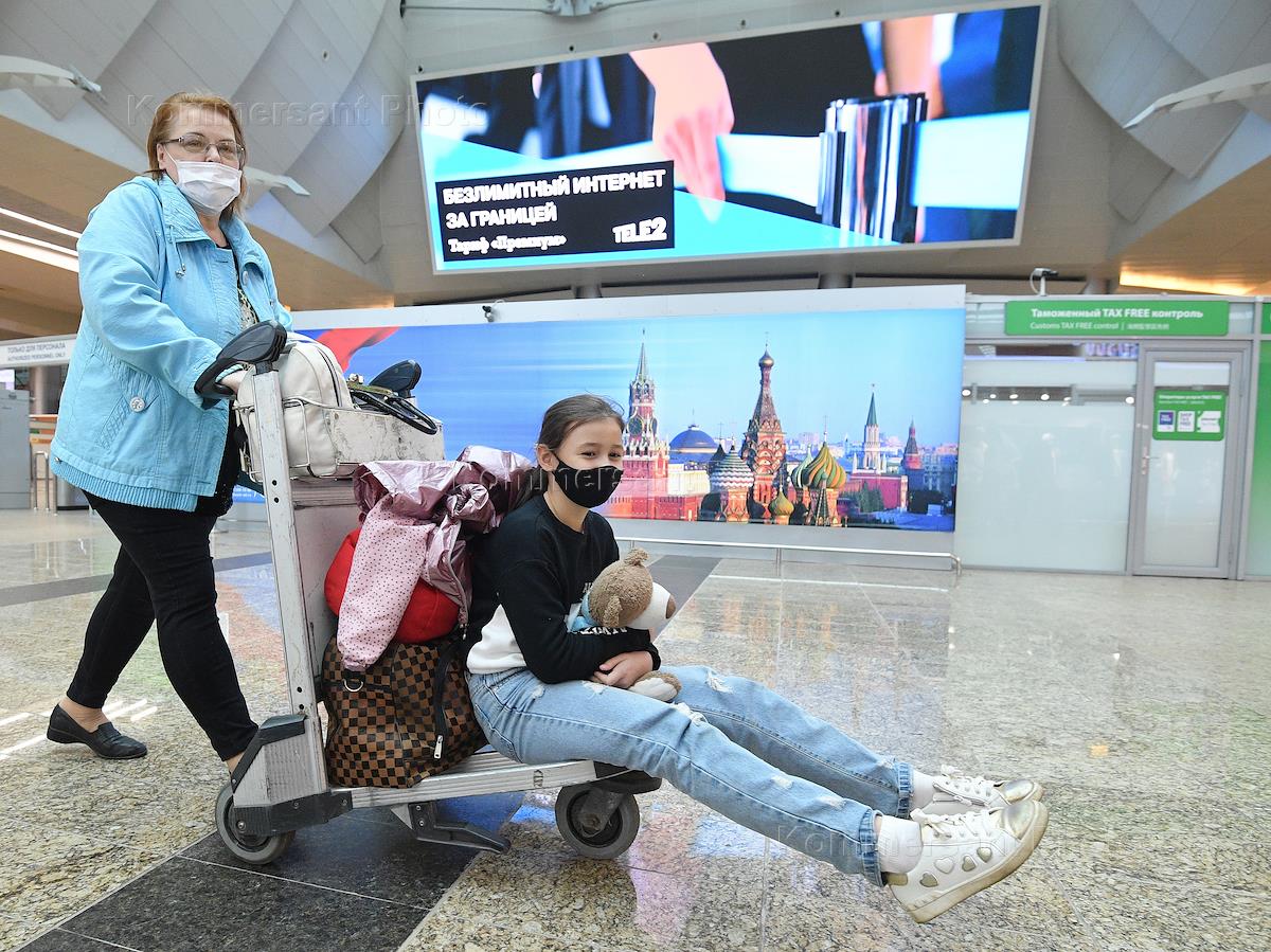 Работа Международного аэропорта Шереметьево имени А.С.Пушкина. Жанровая фотография. Пассажиры в медицинской защитной маске на территории аэропорта.