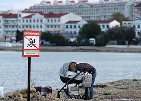 Виды Севастополя. Жанровая фотография. Женщина с детской коляской на берегу моря.