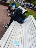 Виды Санкт-Петербурга. Жанровая фотография. Молодой человек в медицинской маске сидит на скамейке в парке.
