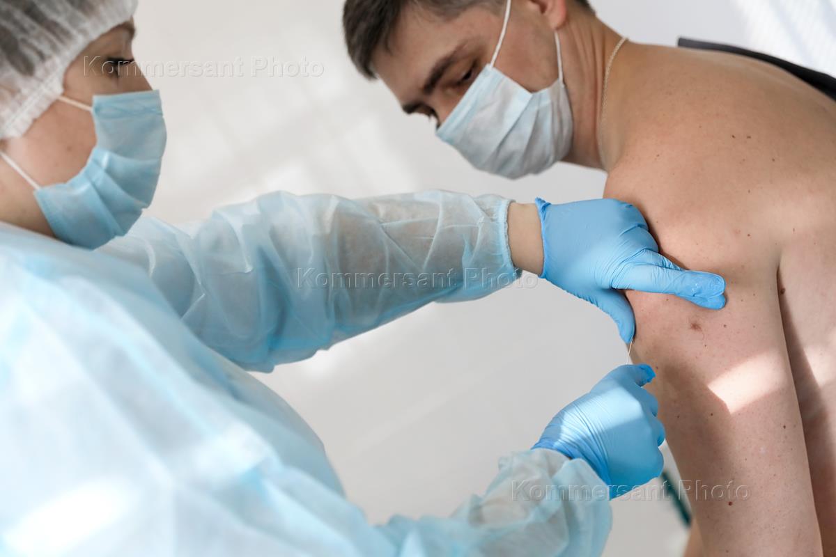 Vaccination with Gam-Covid-Vak, the Sputnik V trademark, is a two-component vector vaccine against COVID-19, developed jointly by the Gamaleya Russian Federal State Budgetary Institution and the 48th Central Research Institute of the Ministry of Defense of Russia. Genre photography. A patient being vaccinated with Gam-Covid-Vac.