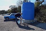 Дефицит питьевой воды в Крыму. Жанровая фотография. Одна из ёмкостей с питьевой водой, установленных во дворах жилых домов Симферополя. Местный житель набирает воду в пластиковые бутылки.
