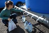 Дефицит питьевой воды в Крыму. Жанровая фотография. Одна из ёмкостей с питьевой водой, установленных во дворах жилых домов Симферополя. Местная жительница набирает воду в пластиковые бутылки.