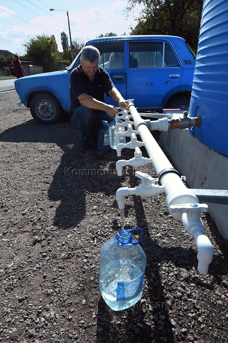 Дефицит питьевой воды в Крыму. Жанровая фотография. Одна из ёмкостей с питьевой водой, установленных во дворах жилых домов Симферополя. Местный житель набирает воду в пластиковые бутылки.