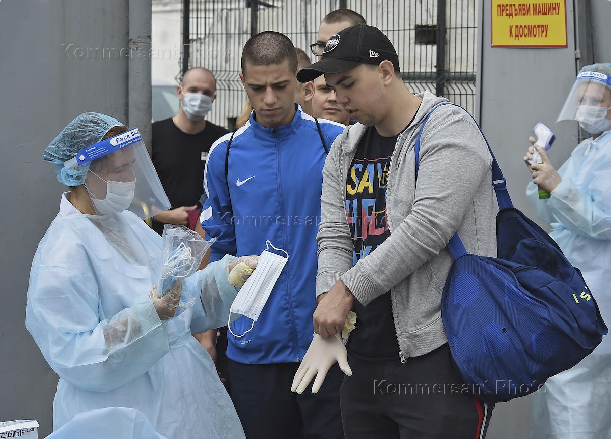 Autumn conscription campaign 2020. The work of the assembly point of the military commissariat of Sevastopol. Genre photography. Conscripts during the delivery of tests to conduct rapid tests to identify infectious diseases.