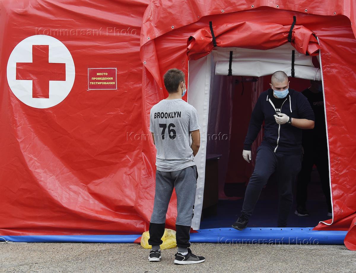 Осенняяя призывная кампания 2020 года. Работа сборного пункта военного комиссариата Севастополя. Жанровая фотография. Медицинские работники во время сбора анализов у призывников для проведения экспресс-тестов на выявление инфекционных заболеваний.