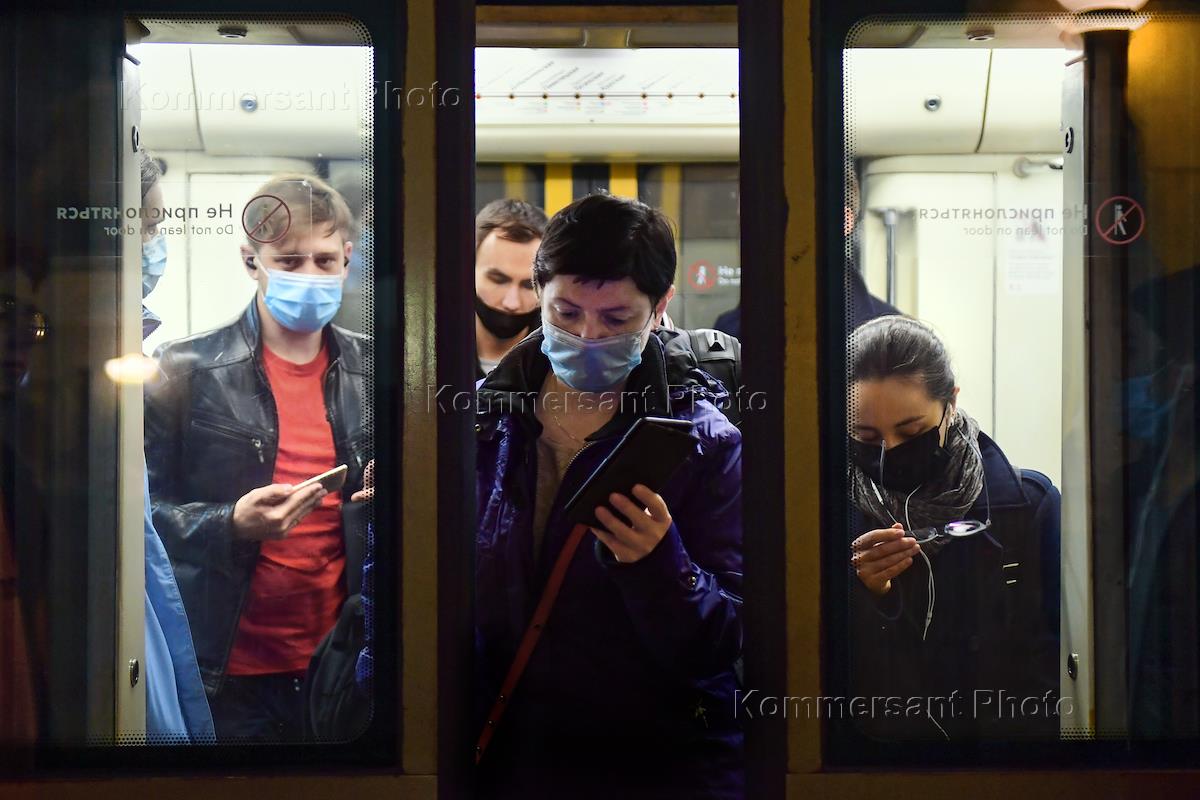 Виды Москвы в период ограничительных мер во время второй волны коронавирусной инфекции. Жанровая фотография. Пассажиры в медицинских масках в московском метро.