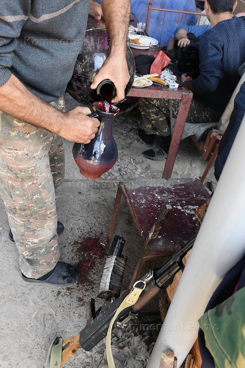 Политическая ситуация в Нагорном Карабахе во время конфликта. Жанровая фотография. Мужчины выпивают домашнее вино.