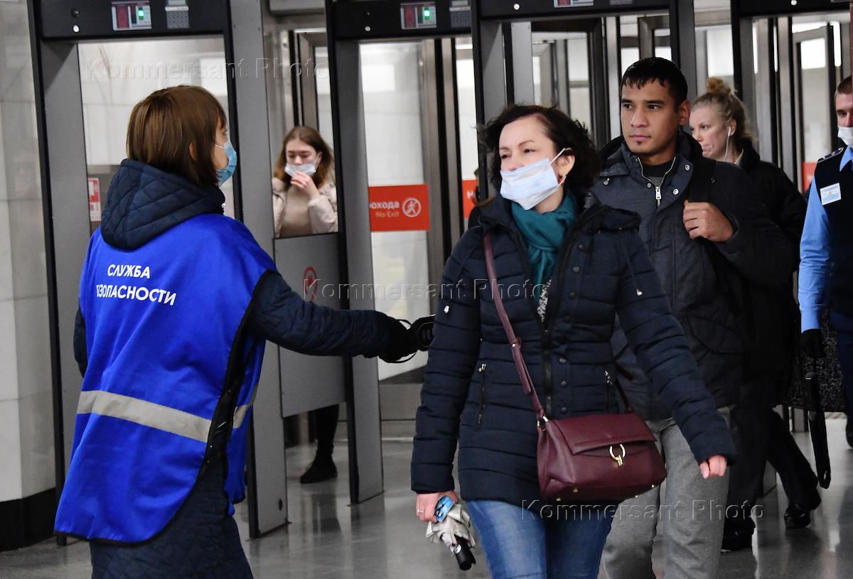 Виды Москвы в период ограничительных мер во время второй волны коронавирусной инфекции. Жанровая фотография. Сотрудник службы безопасности возле кассв при входе нас станцию метро.