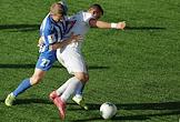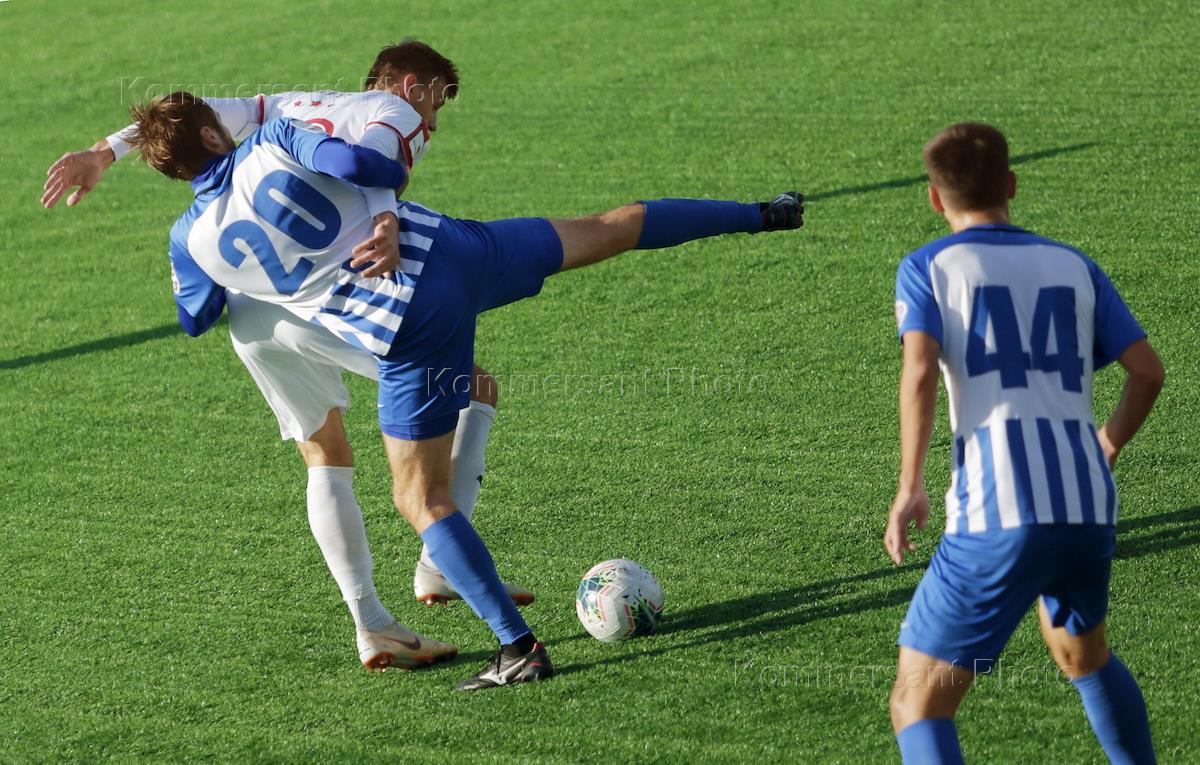 ОЛИМП-Первенство ПФЛ. Группа 3. Сезон 2020/2021, 11 тур. Матч между командами "Сокол" (Саратов) и "Салют Белгород" (Белгород) на стадионе "Локомотив". Игроки команды "Сокол" Айдар Лисинков (справа) и Александр Столяренко (слева) во время матча.