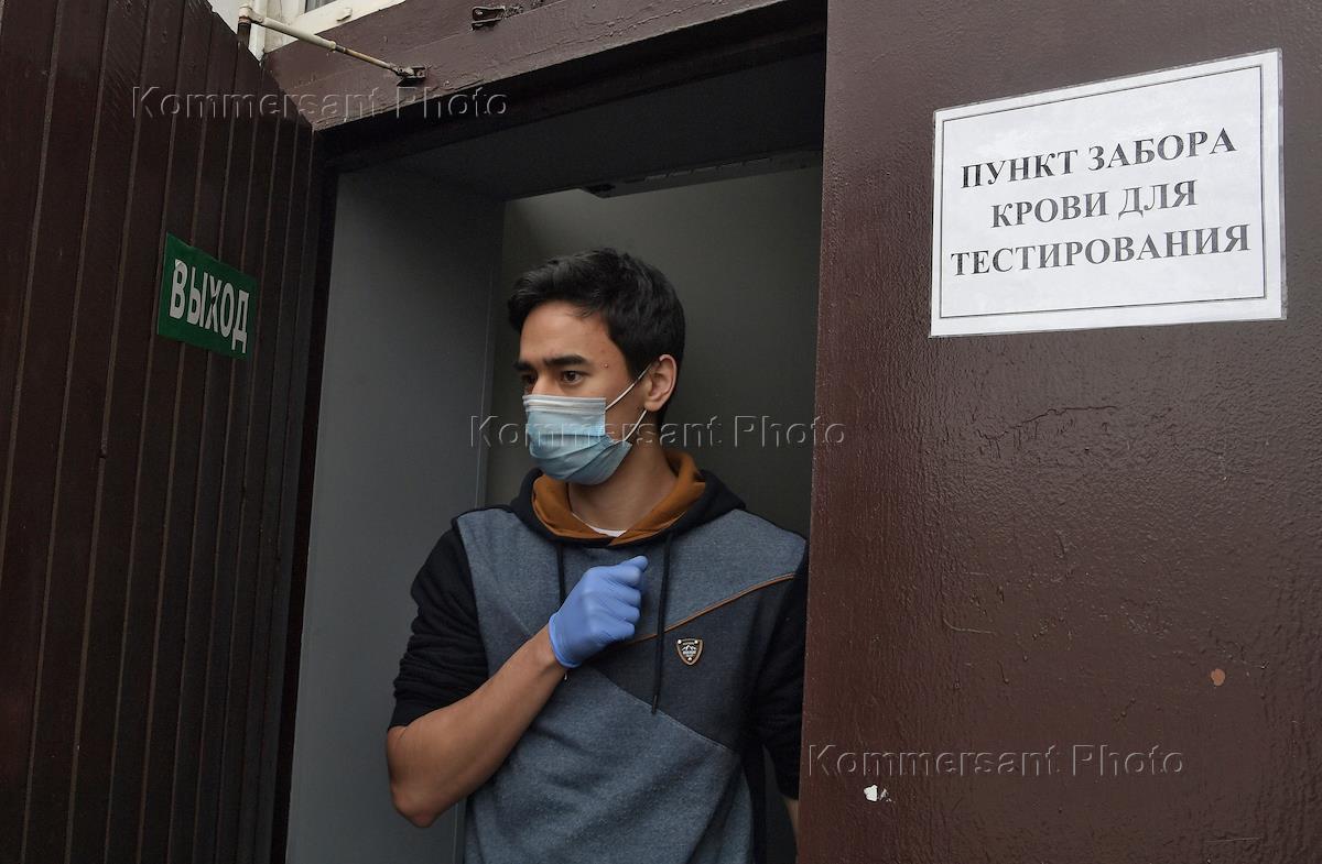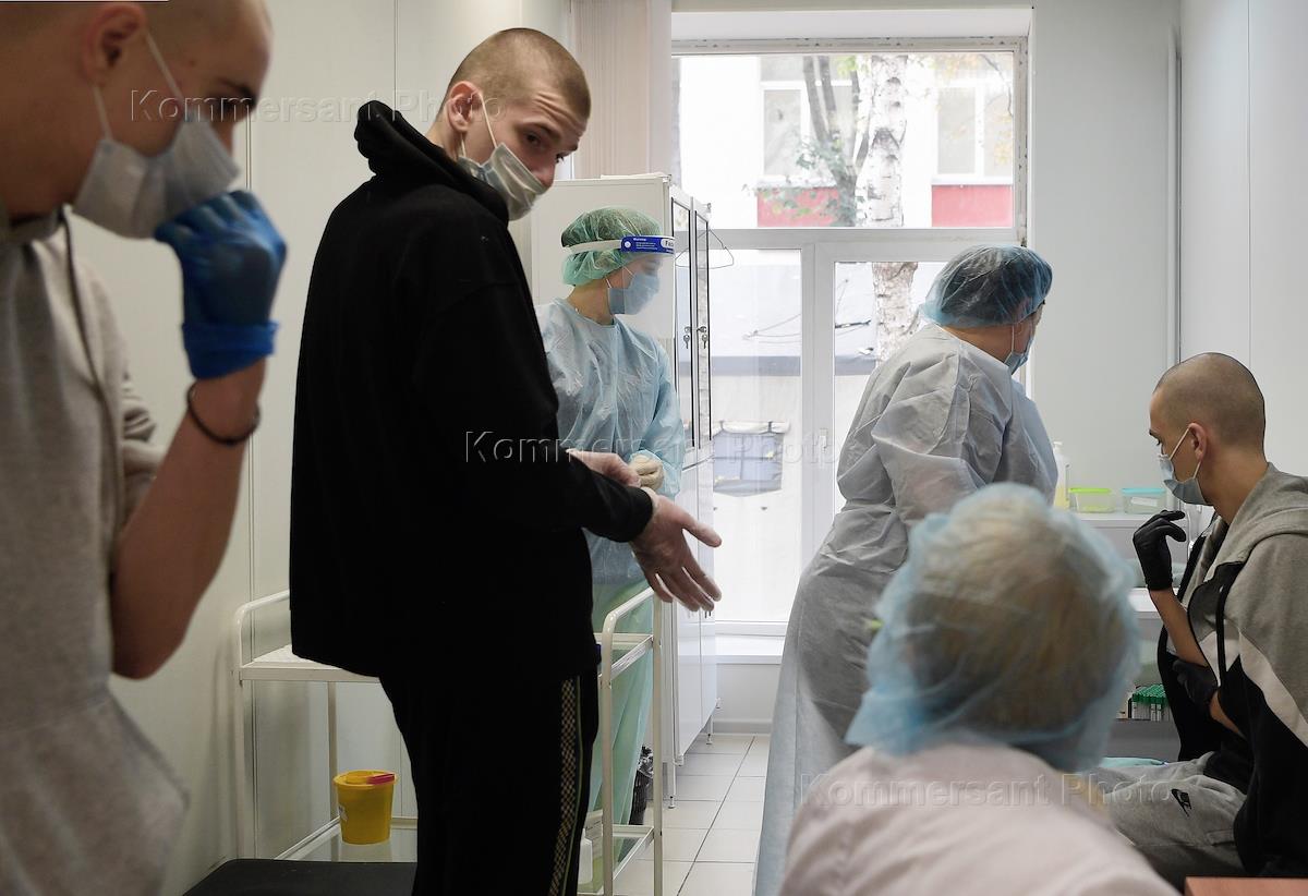 Осенняя призывная кампания 2020 года. Жанровая фотография. Призывники на Сборном призывном пункте военного комиссариата города Москвы во время сдачи анализов для проведения экспресс-тестов перед отправкой к местам прохождения военной службы.