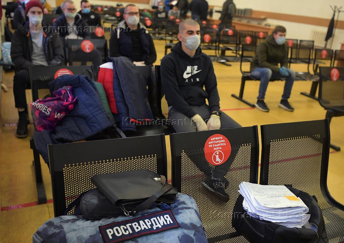 Осенняя призывная кампания 2020 года. Жанровая фотография. Призывники на Сборном призывном пункте военного комиссариата города Москвы перед отправкой к местам прохождения военной службы.